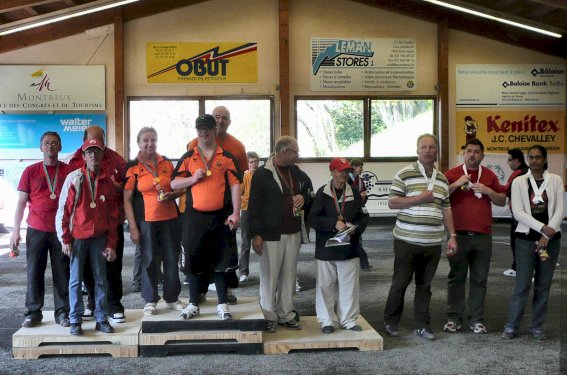 Quatre des cinq triplettes engagées ont gagné des médailles et Eric, motivé à bloc, a même pu monter sur la plus haute marche du podium avec ses partenaires Jacques et Susanne. Ils ont gagné la finale contre l'équipe MUSCAT du club de sport handicap de Sion de justesse par 7 à 6.