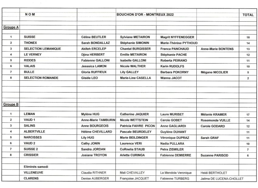 Dans le groupe B à relever la victoire des joueuses du Léman, devant Vaud 1 et les deux formations françaises de Salins et d’Albertville.